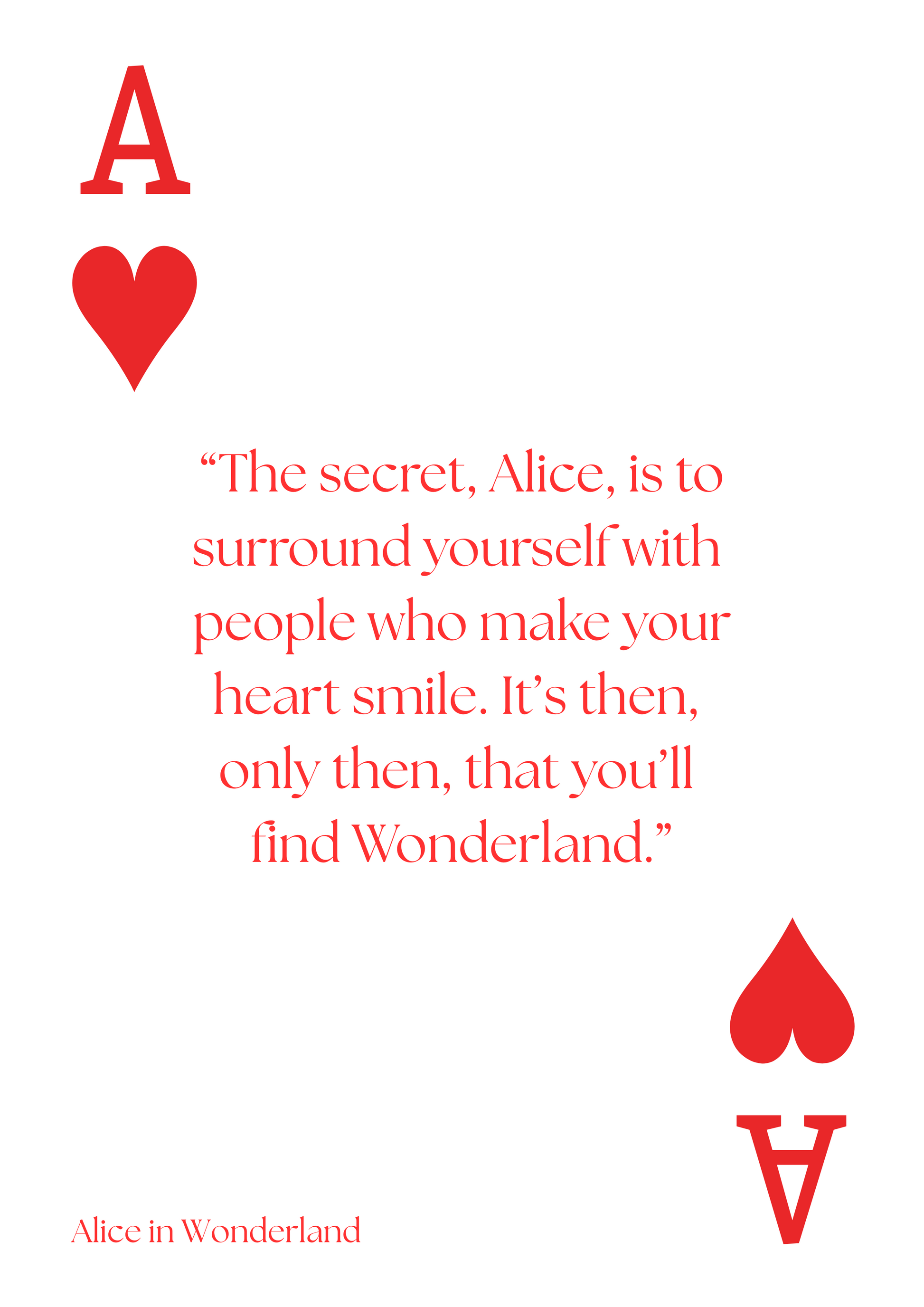 Bring a touch of simplicity and inspiration into your space with this beautifully designed Alice in Wonderland quote print. Featuring a heartfelt reminder “The secret, Alice, is to surround yourself with people who make your heart smile. It's then, only then, that you'll find Wonderland” this artwork blends classic playing-card style with timeless literary charm. Perfect for book lovers, dreamers, or anyone who adores Lewis Carroll’s Wonderland, it makes a unique gift or a striking wall print. Printed on high-quality paper, this design adds magic and meaning to any home, office, or creative space.