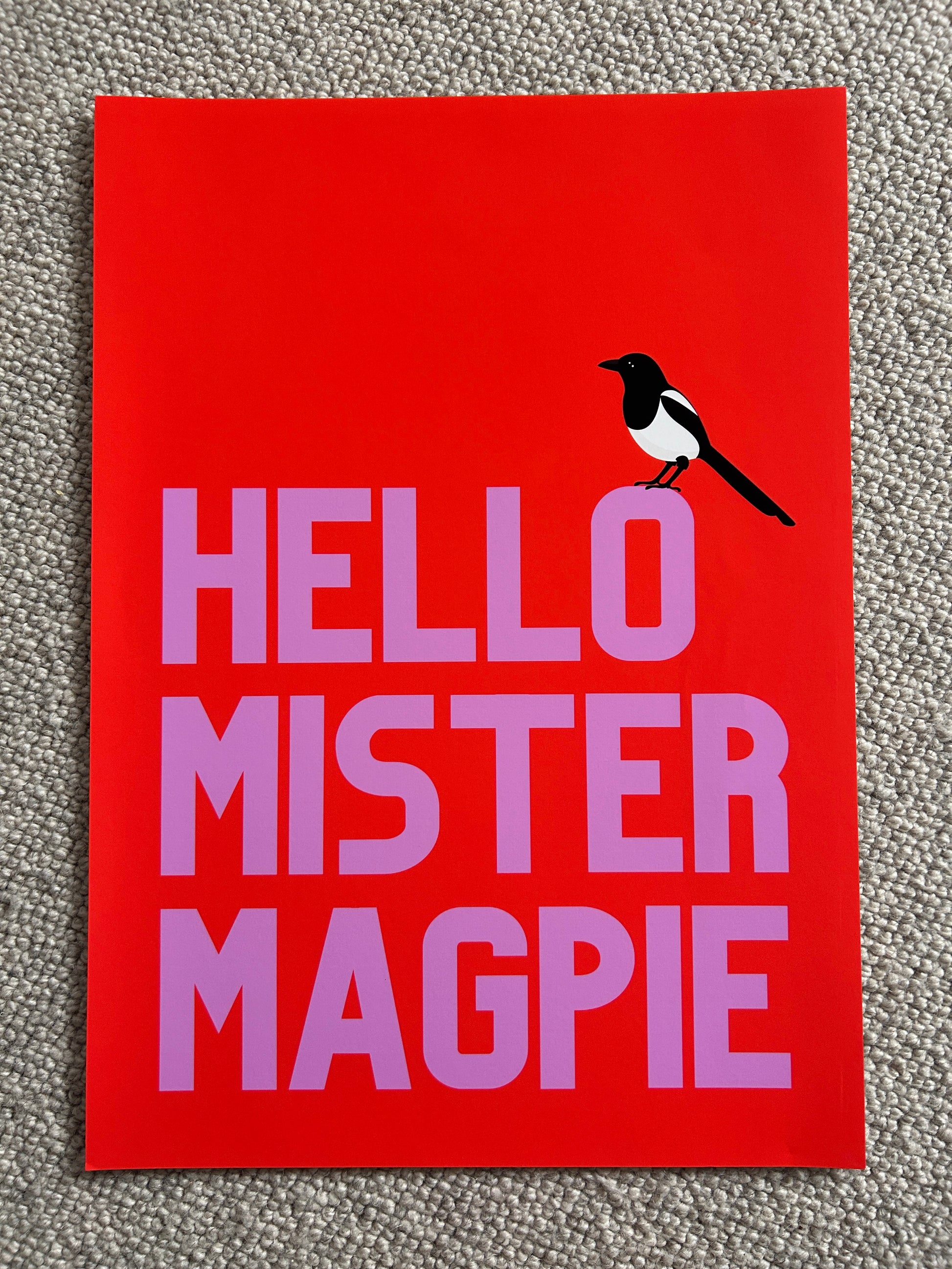 A vibrant wall art print featuring the phrase "Hello Mister Magpie" combines striking colour with the elegant magpie. The black and white magpie, often associated with folklore and superstition, stands out against the bright graphic wording. This bright artwork that comes in multiple colour combinations brings together nature and bright graphic design and is perfect for adding character and positivity to any room.