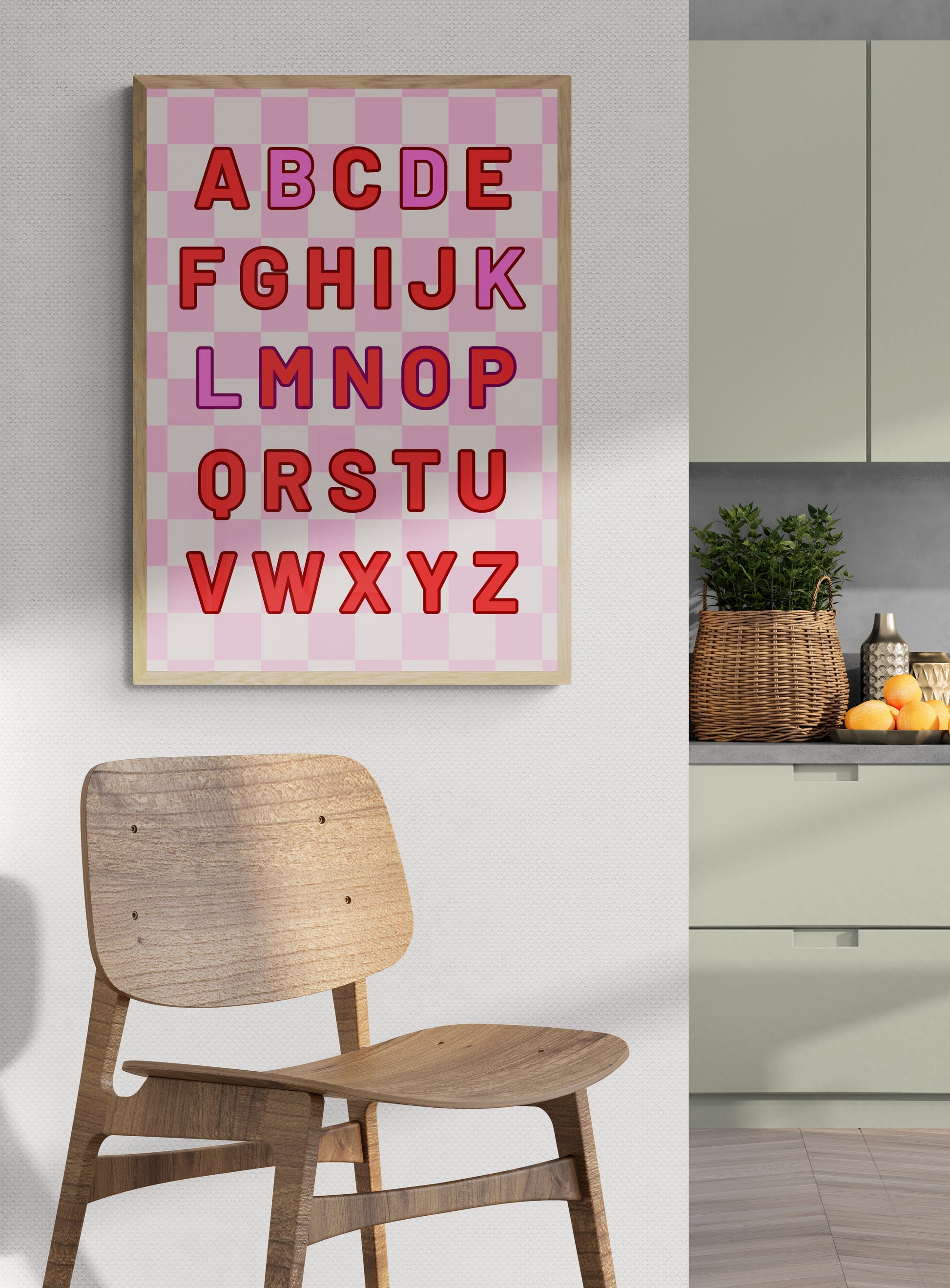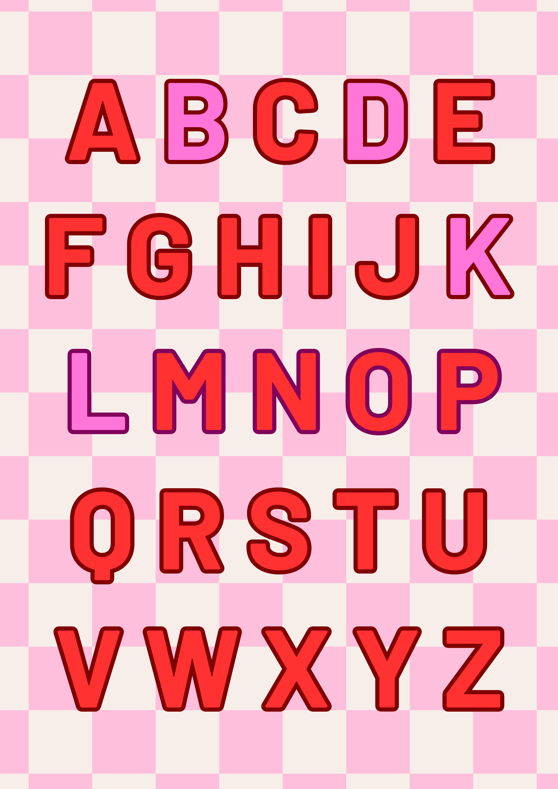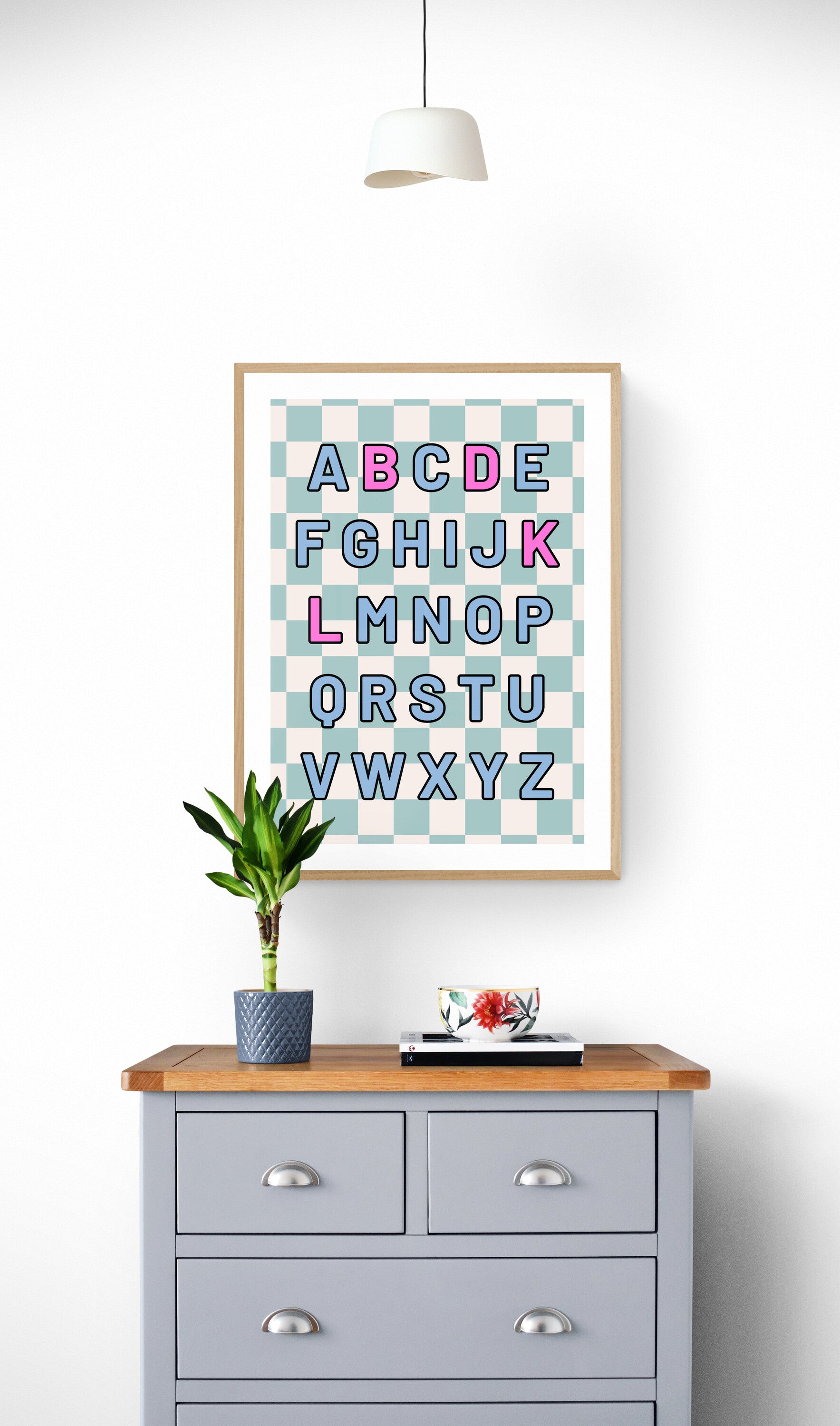 Personalise this bright and joyful alphabet print with your family's own initials highlighted in a different colour.