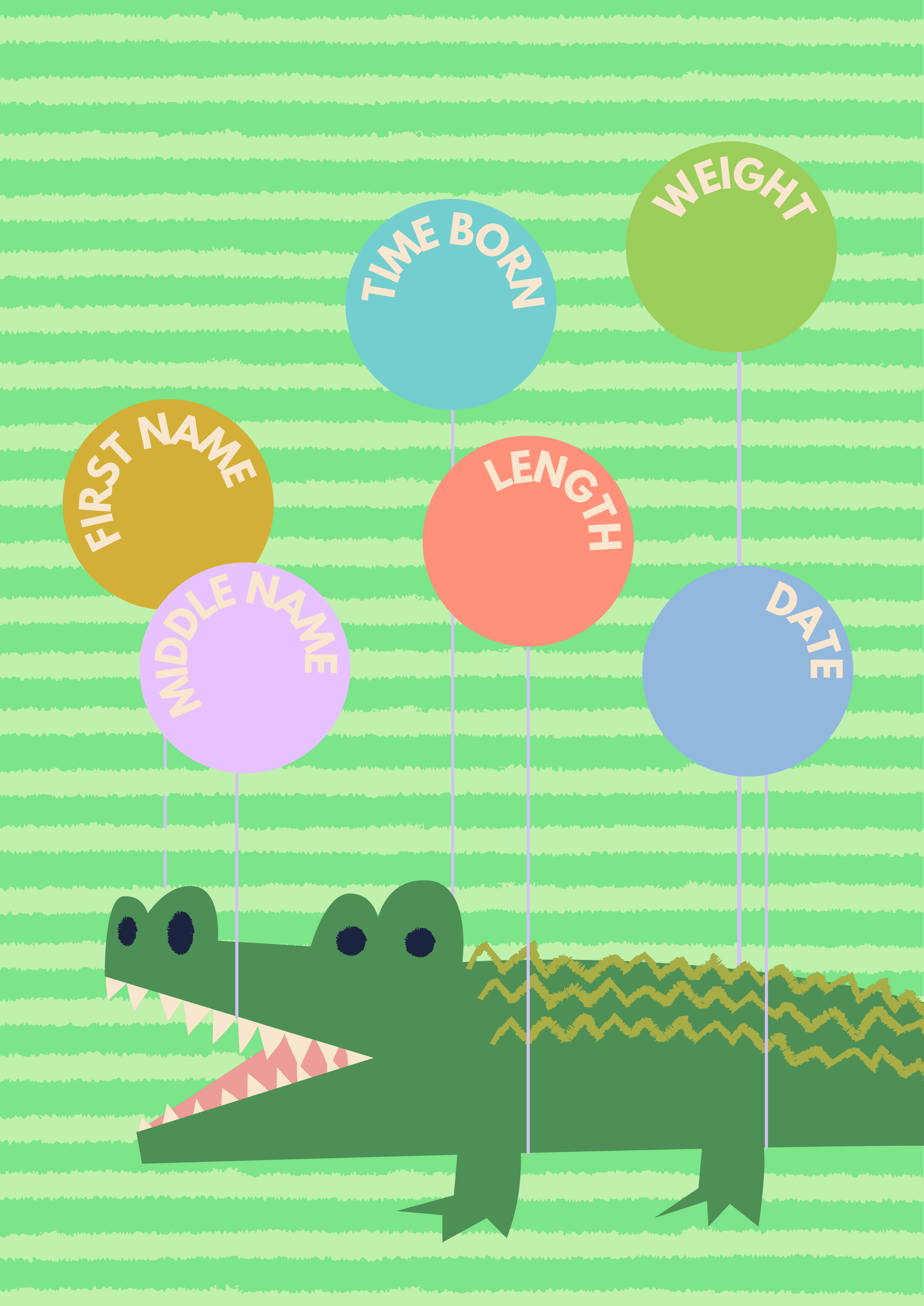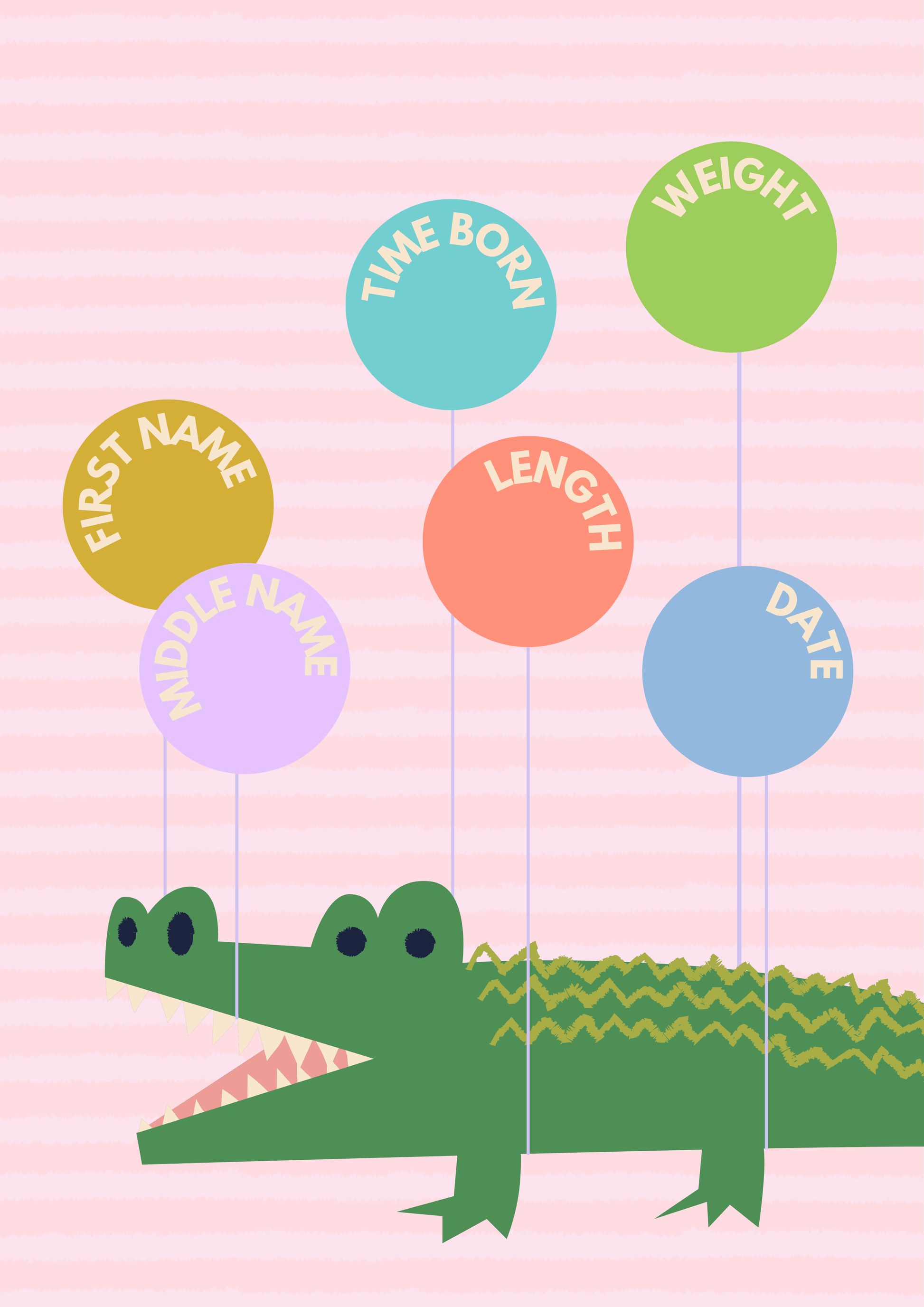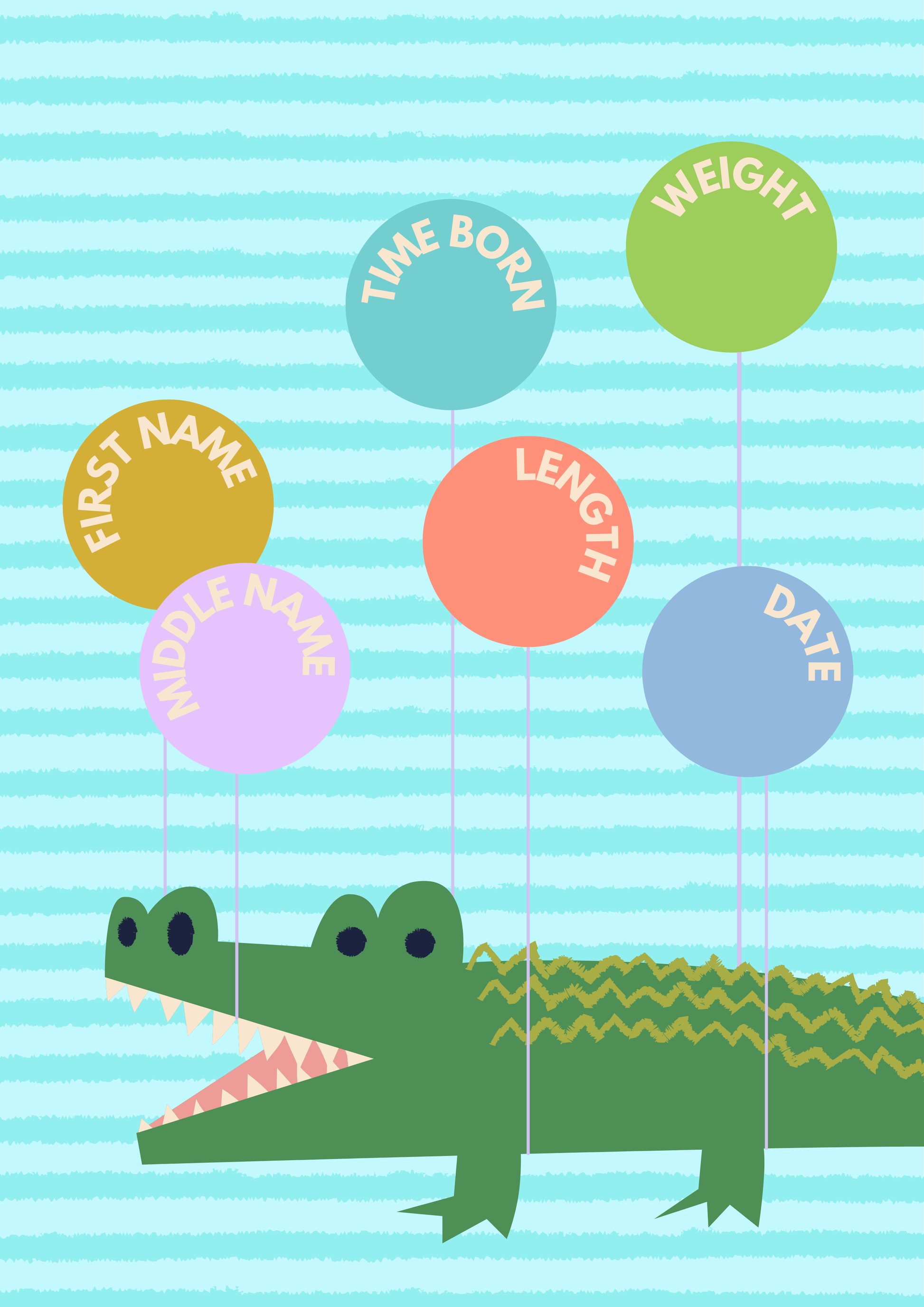 Celebrate a new arrival with this beautifully personalised newborn print featuring a friendly crocodile holding balloons, each one filled with a special detail: