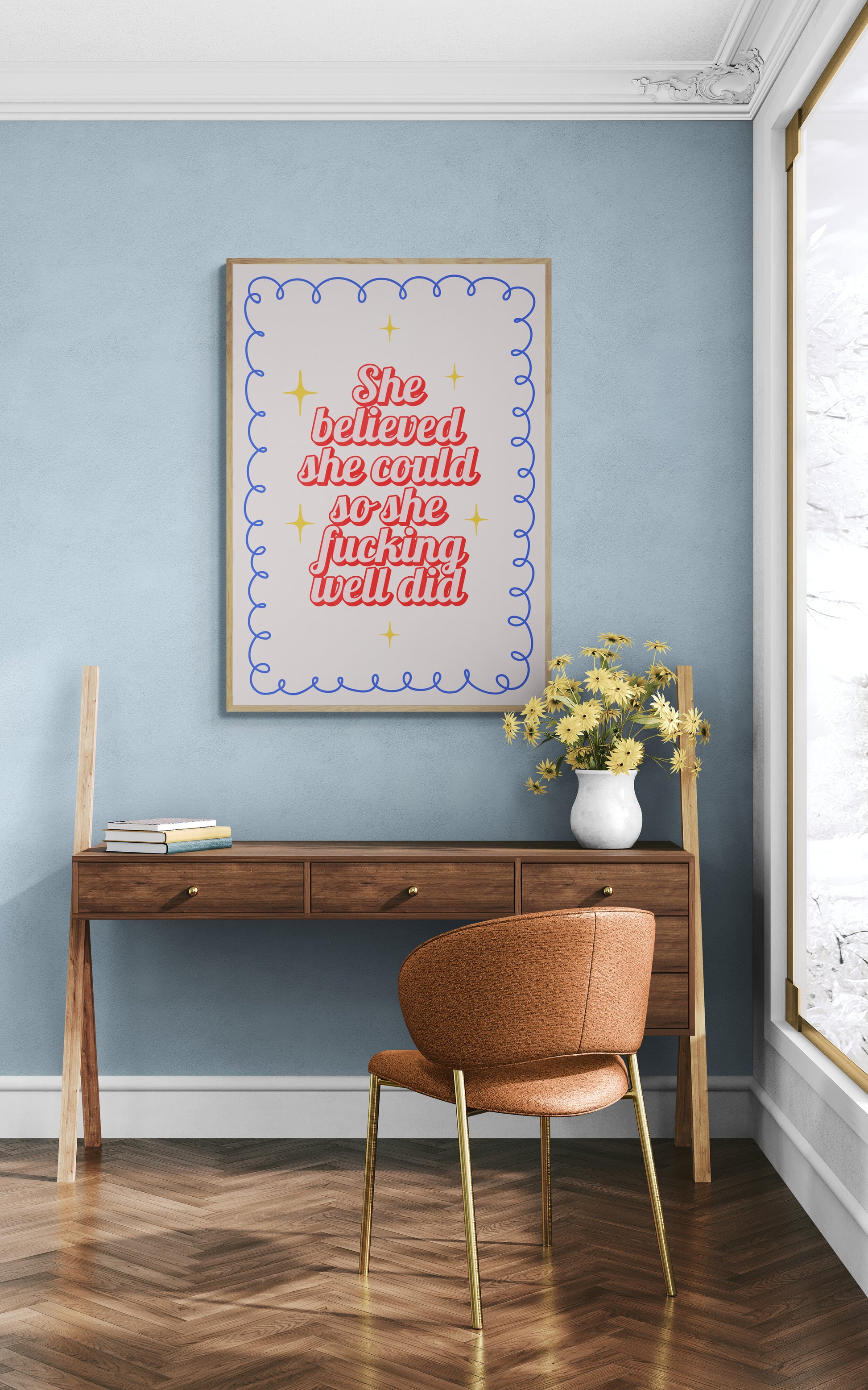 This bright bold print has the words "she believed she could so she fucking well did" with bright stars surrounding the lettering and a blue swirly border. A print to hang in your office, to remind you that you have or you will and keep giving you the motivation that you need.