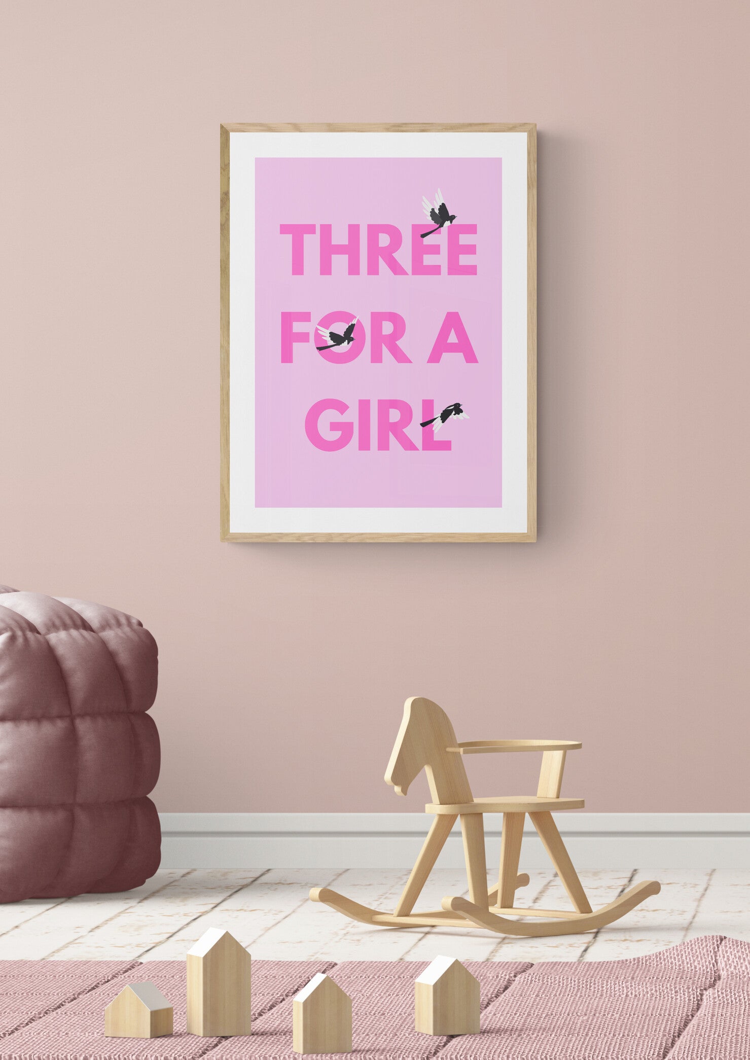 This "Three for a Girl" magpie art print offers a bold, vibrant take on the classic folklore rhyme. Featuring three striking magpies in deep blacks and crisp whites, the artwork brings dynamic energy to any space. The birds are depicted in various playful poses, set against a choice of bright colour tones. This bold print is perfect for those new arrivals to the world or on your kids bedroom wall.