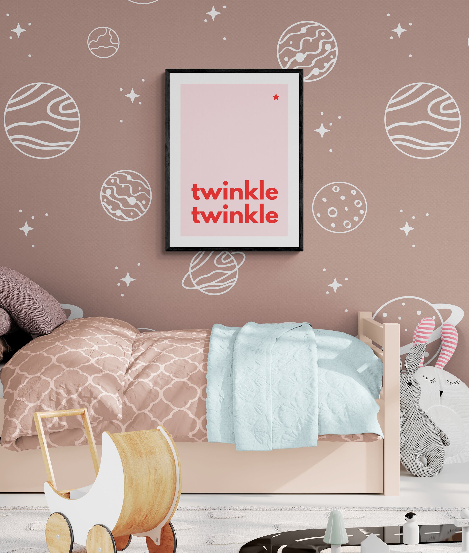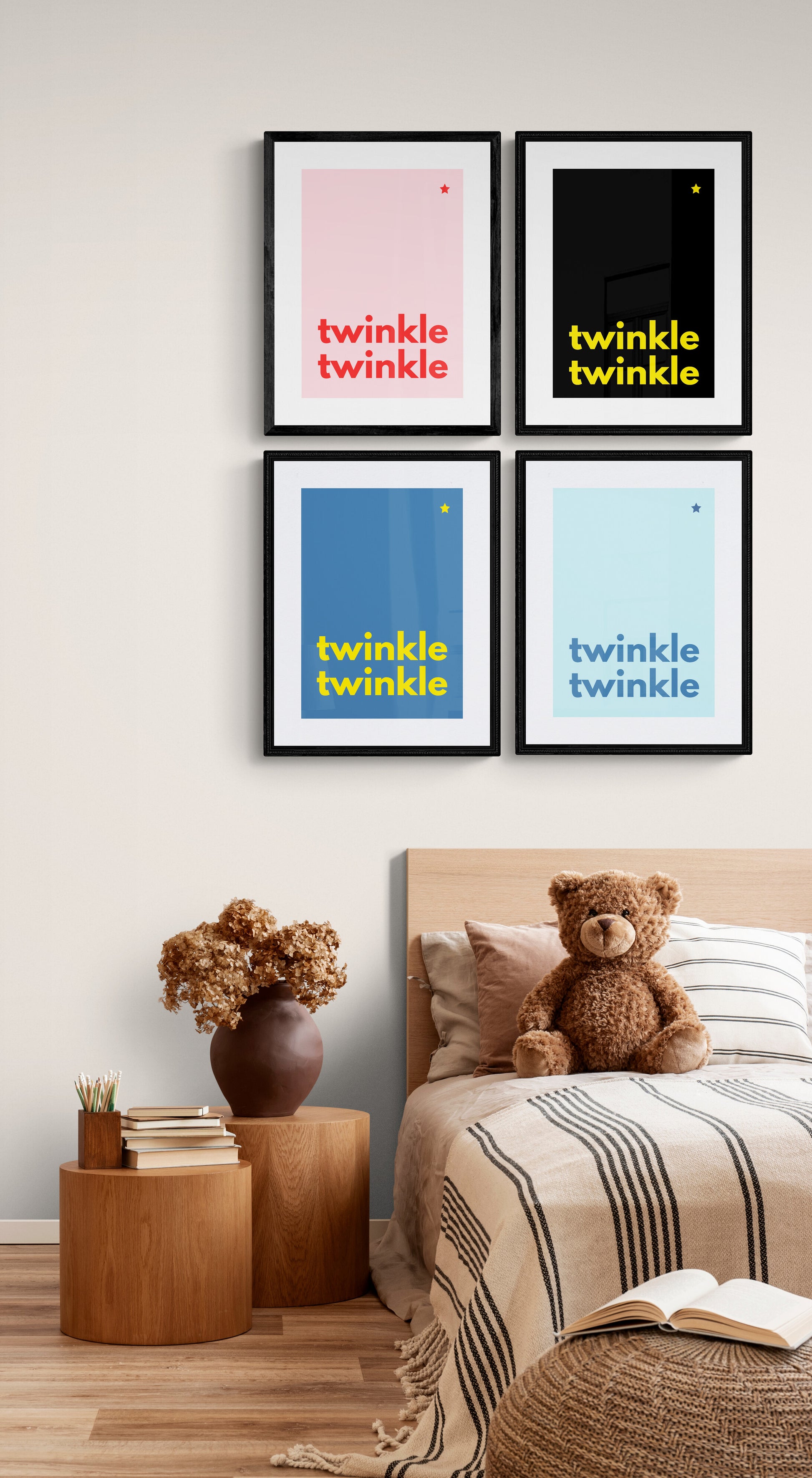 Add a touch of magic to your child’s room with this "Twinkle Twinkle Little Star" art print. Featuring bold, playful typography for "Twinkle Twinkle" and a single, delicate star, this design is both modern and timeless.