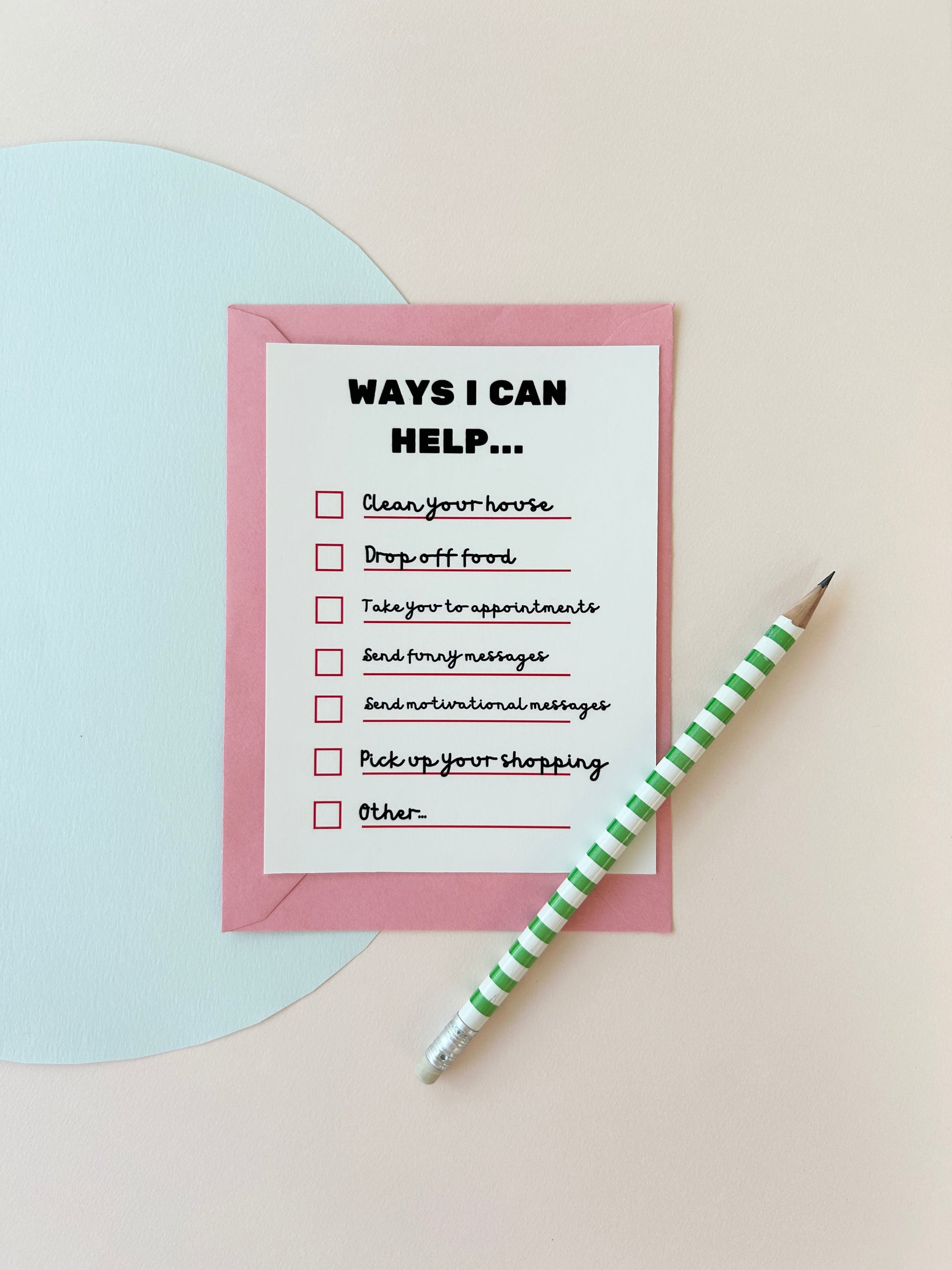 Show you care in a meaningful way with a "Ways I Can Help" support card. Thoughtfully designed for friends, family, or loved ones facing cancer, this unique greeting card allows the giver to offer the recipient direct ways of helping as oppose to asking "how can I help".