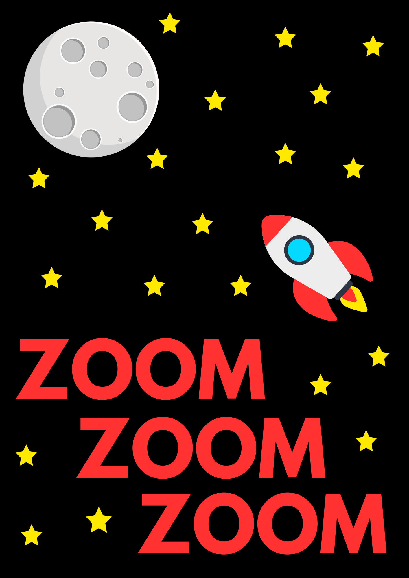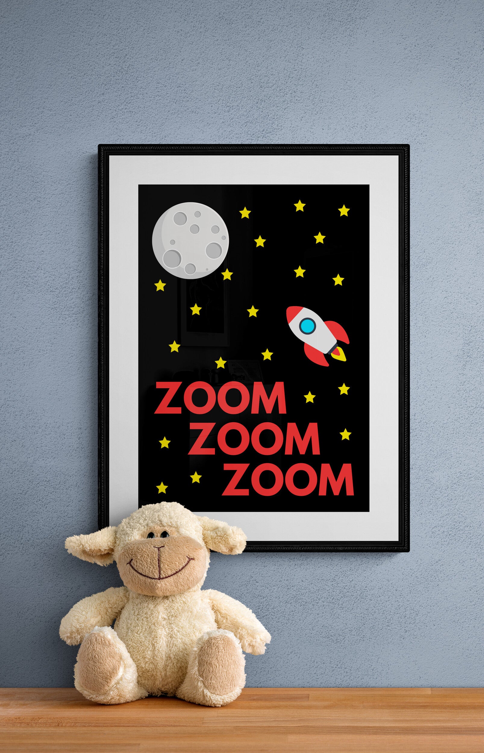 Blast off into fun with this bold and playful "Zoom Zoom Zoom" kids’ print. One of our most popular prints, featuring a striking black background, vibrant red lettering, and a rocket soaring towards the moon surrounded by twinkling stars, this design is perfect for little space enthusiasts.